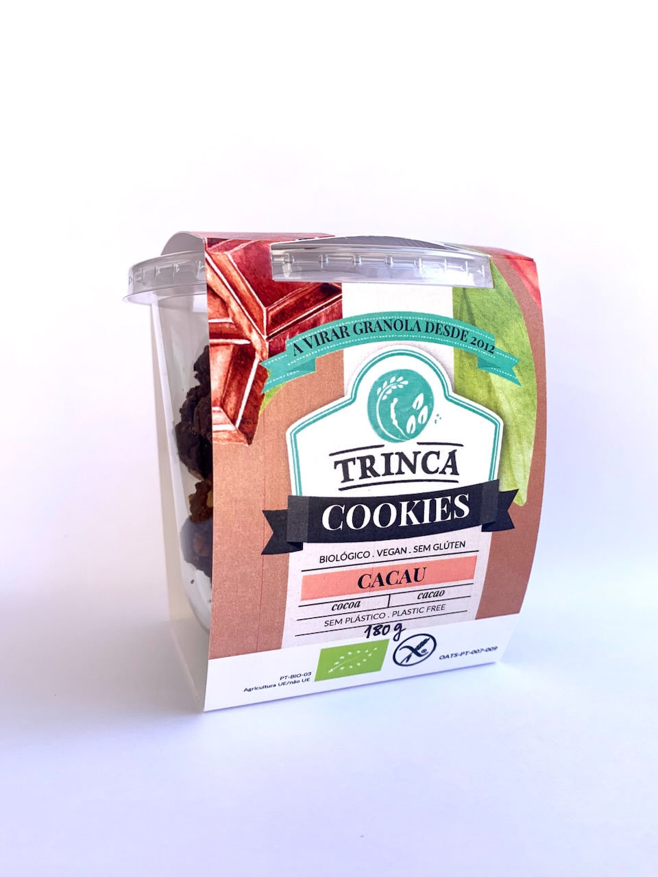 vegan · biológico · isento de glúten · Não te deixes enganar pelo cacau. Usamos o mesmo de incrível qualidade que na nossa famosa granola de cacau e framboesa. São bem docinhas, crocantes e tão achocolatadas! Ninguém mas mesmo ninguém vai acreditar que são feitas maioritariamente de ingredientes integrais.