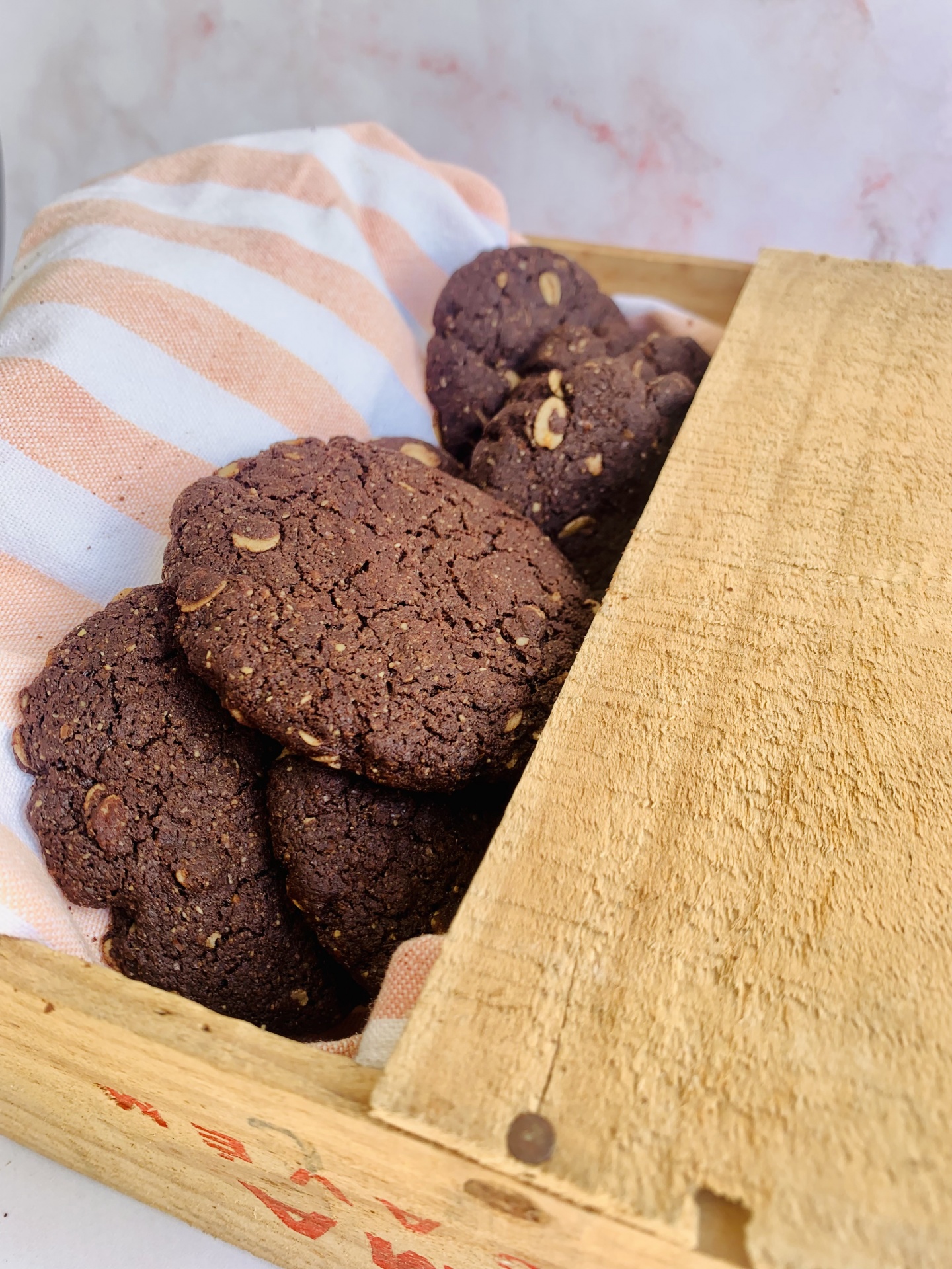 ingredientes. mix de farinhas (arroz integral*, amido de mandioca*, linhaça castanha*, aveia integral - sem glúten*, cacau*, psyllium*), óleo de coco*, açúcar de coco*, flocos de aveia* (sem glúten), água, xarope de tâmaras*, bicarbonato de sódio, sal marinho.