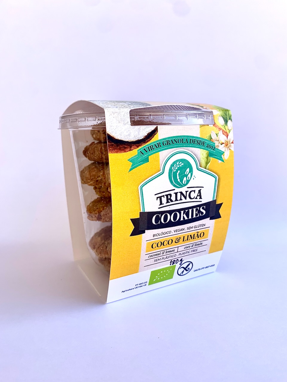 ingredientes. mix de farinhas (arroz integral*, amido de mandioca*, aveia integral - sem glúten*, linhaça castanha*, psyllium*), óleo de coco*, açúcar de coco*, coco ralado*, flocos de aveia* (sem glúten), limão*, xarope de tâmaras*, bicarbonato de sódio, sal marinho.