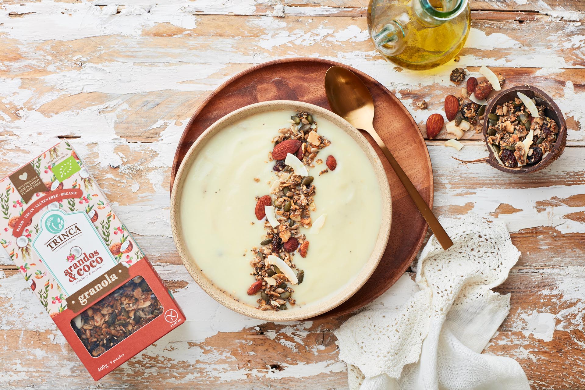 isento de glúten · sem cereais · vegan Esta é a granola que combina com tudo... Come-a como snack, usa-a como topping em saladas ou sobremesas ou com iogurte. E o melhor de tudo? Como é tão rica em gorduras saudáveis, mantém-te satisfeito durante muito tempo.