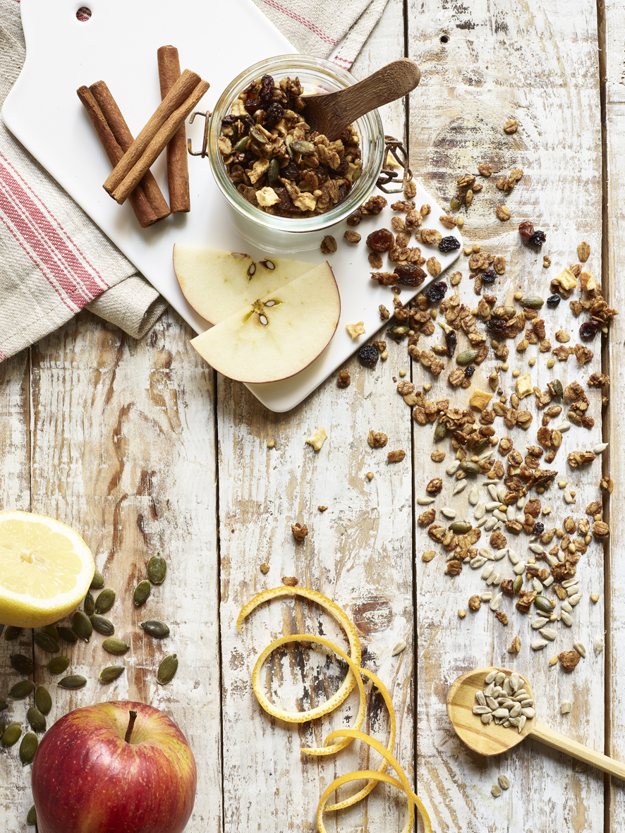 vegan · isenta de glúten Uma mistura clássica de sabores que nos transporta para épocas festivas. Esta granola tem o poder de transformar o teu aborrecido iogurte de pequeno-almoço num verdadeiro, delicioso e indulgente crumble de maçã! E para melhorar tudo, é adoçada com açúcar de coco!